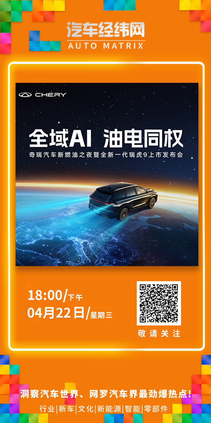 2026年4月22日,全域AI 油电同权 奇瑞汽车新燃油之夜暨全新一代瑞虎9上市发布会将举行,敬请期待。